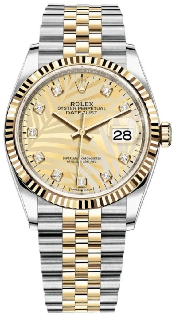 $239.00 – $859.00Price range: $239.00 through $859.00Rolex Datejust 36 Steel & Yellow Gold Golden Palm-Motif Diamond Dial Women’s Watch M126233-0043