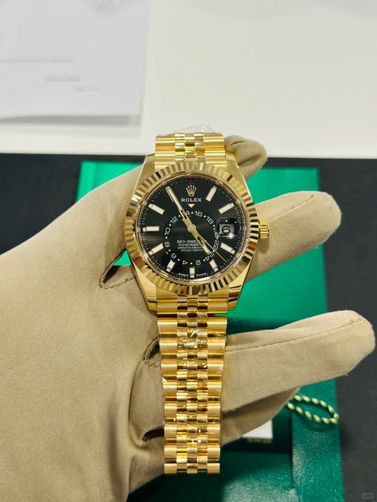 Rolex Sky-DwellerYellow Gold Sky-Dweller Jubilee 336938-0005 Fluted RingCommand Bezel Black Index Dial Watch 2024
