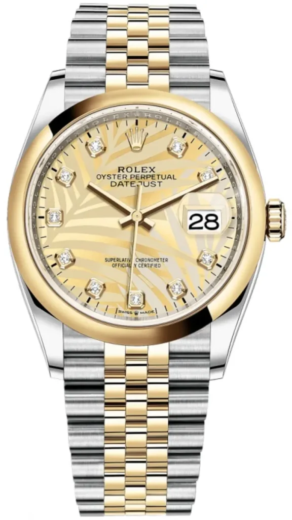 $239.00 – $859.00Price range: $239.00 through $859.00Rolex Datejust 36 Steel & Yellow Gold Golden Palm-Motif Diamond Dial Women’s Watch M126203-0043