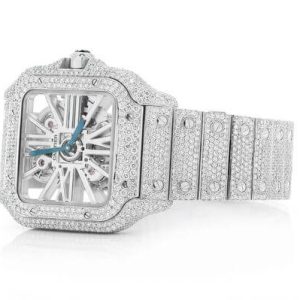 CARTIER SKELETON WATCH ICED OUT SANTOS 40MM STEEL SILVER REPLICA FULL MOISSANITE STUDDED
