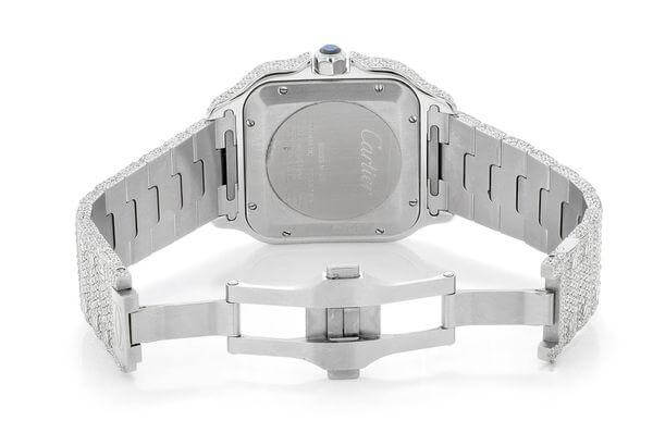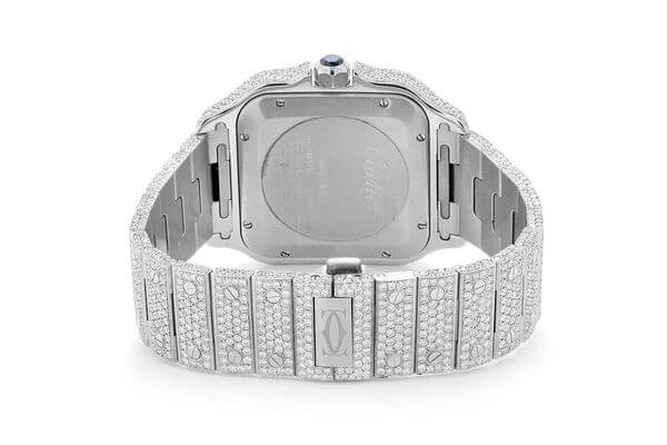 ICED OUT CARTIER WATCH 100 XL WITH DIAMONDS Santos watch, large model, mechanical movement with automatic winding 1847 MC. Steel case, 7-sided crown adorned with a faceted synthetic spinel, silvered opaline dial, blued steel sword-shaped hands, sapphire crystal. Steel bracelet with “SmartLink” size setting system. Second strap in calfskin, with interchangeable steel folding clasp. Both bracelets are equipped with the “QuickSwitch” interchangeability system. Case width: 39.8mm, thickness: 9.08mm. Waterproof up to 10 bars (~ 100 meters).
