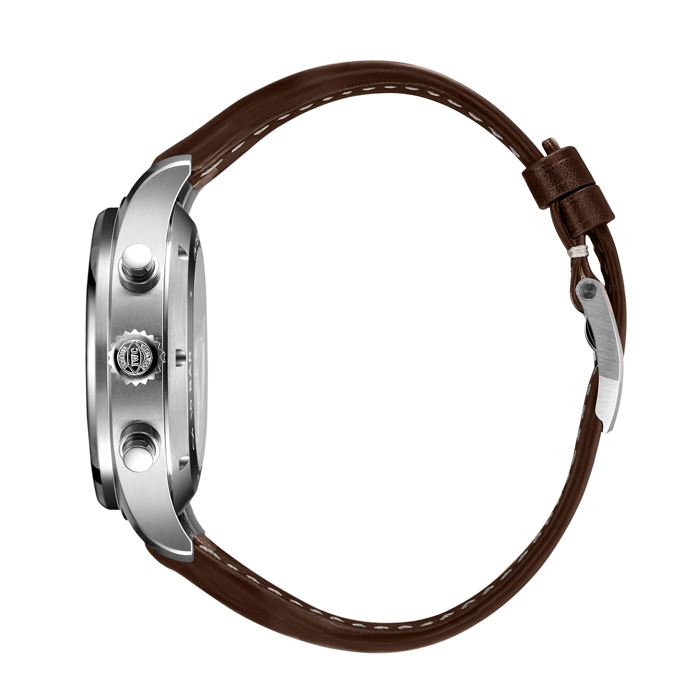 Highlights: This Pilot’s Watch Chronograph (ref. IW378005) features a stainless steel case with a diameter of 43mm, a green dial, and rhodium-plated hands. The high-contrast dial with large Arabic numerals and the triangle index marker at 12 o’clock has been designed in the style of an easy-to-read cockpit instrument. Thanks to luminescent elements, the time can be read at a glance, even at night, or in difficult visibility conditions. The IWC-manufactured 69385 caliber, a precise and robust chronograph movement in classic column-wheel design, enables measurement of stop or aggregate times of up to 12 hours. The hours are displayed on the counter at 9 o’clock, the minutes at 12 o’clock. The small second features a red hand and is located at 6 o’clock. The self-winding movement with a power reserve of 46 hours is visible through the sapphire glass back. Water-resistant to 10 bar, the chronograph is fitted on a brown calfskin strap with a pin buckle. Thanks to the integrated EasX-CHANGE® system, the strap can be easily changed without additional tools.