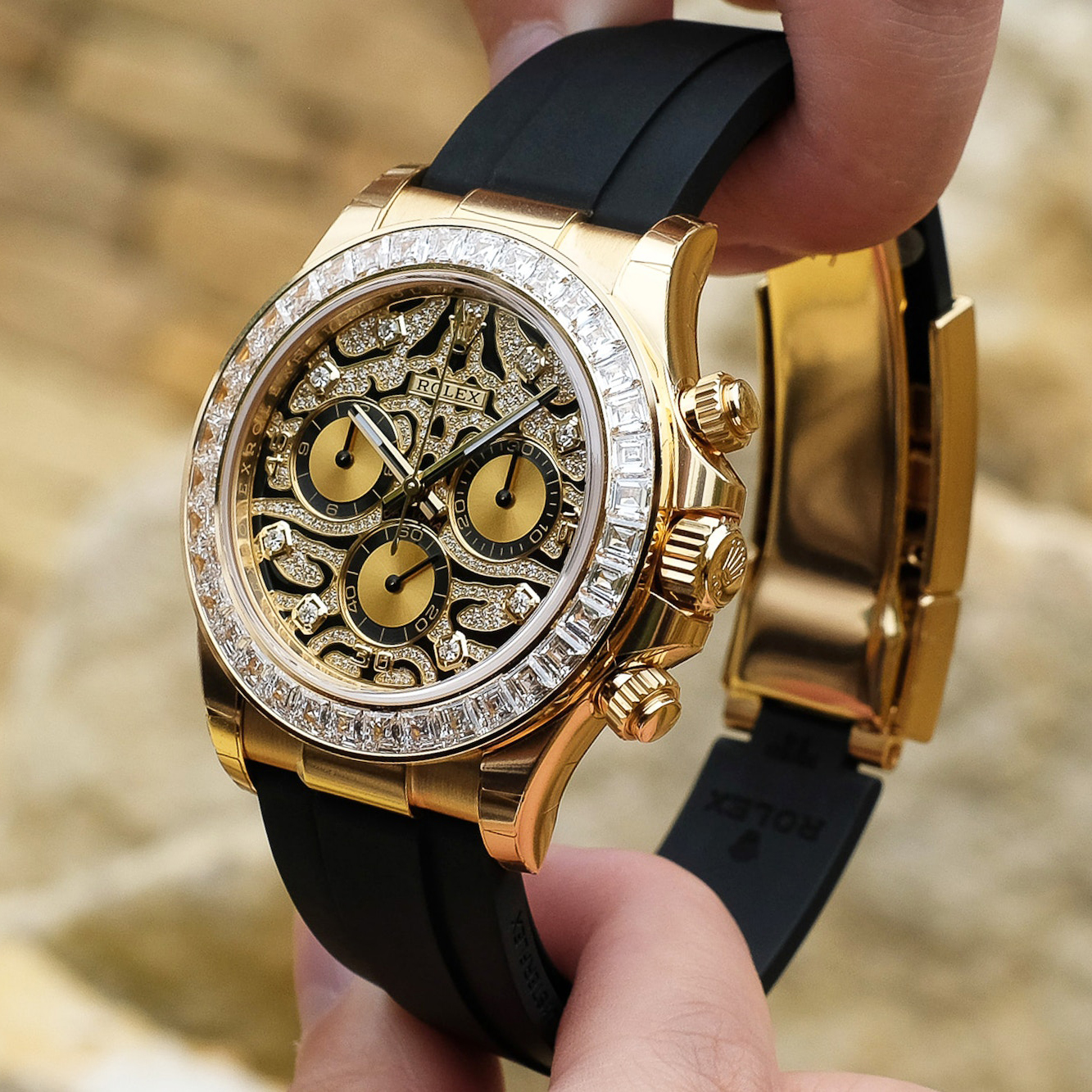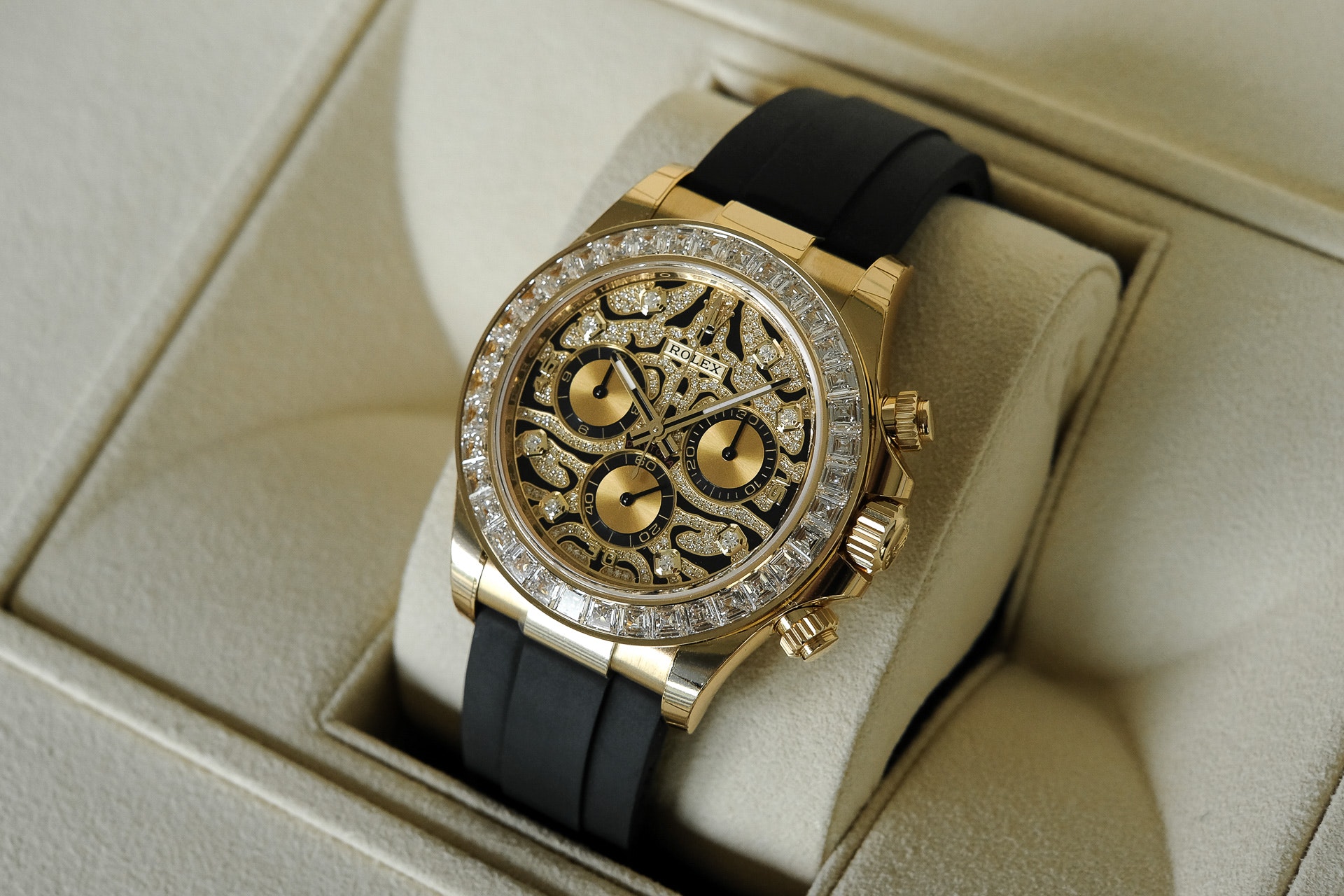 A Rolex Daytona with diamonds is not something new but one with a dial like the 116588TBR sure is! The black-lacquered dial has an applied 18k yellow-gold and diamond-set, wavy structure on the surface, which can remind you of a tiger’s fur.