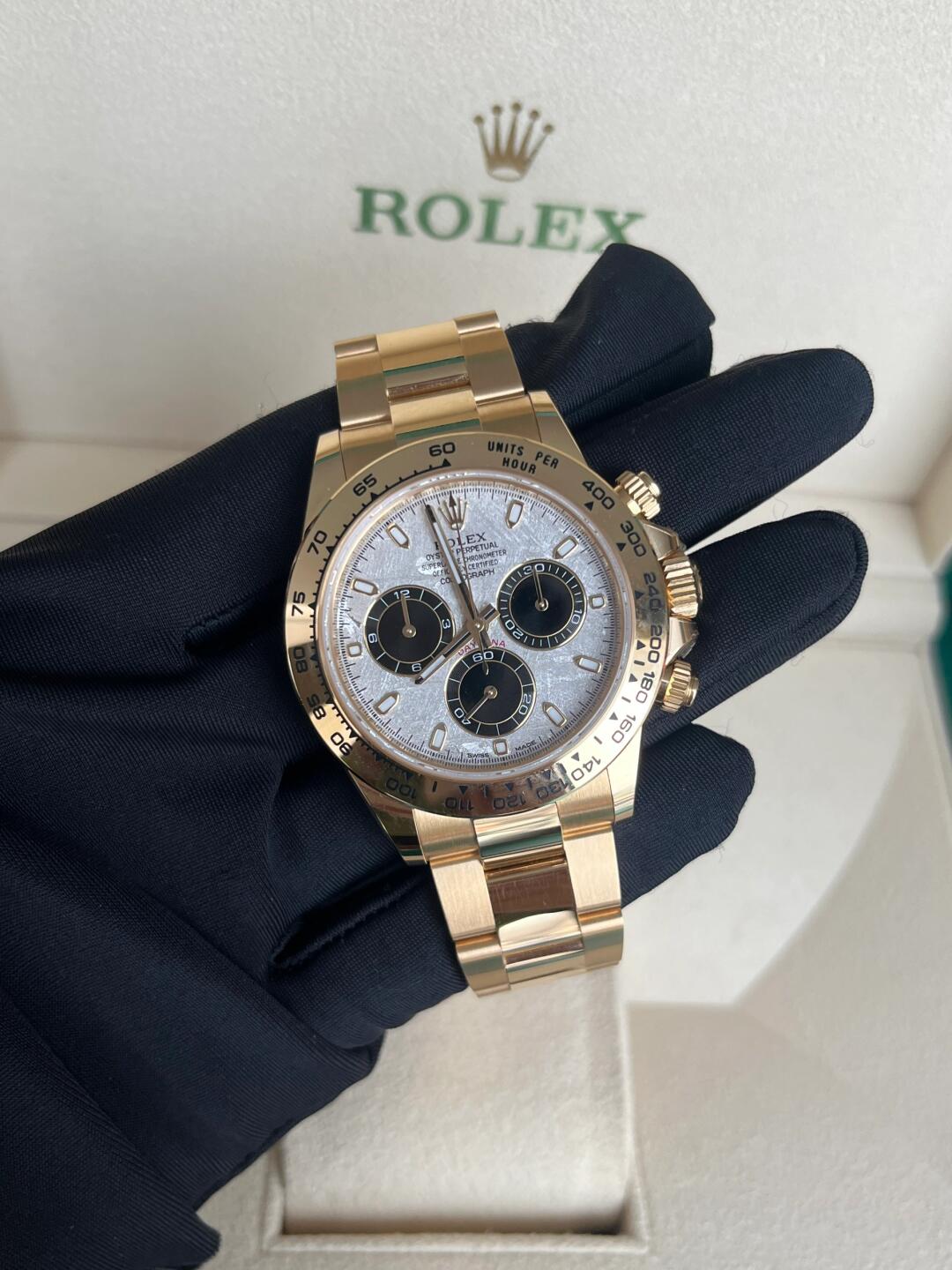 During its journey, the centre of the meteorite is gradually transformed, producing highly unusual metallic patterns, resulting from the very slow cooling of molten asteroid cores. The designers at Rolex create from these configurations a unique treasure for some of the most prestigious models, including this Cosmograph Daytona.