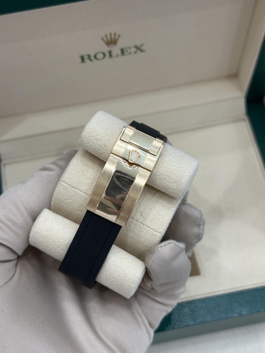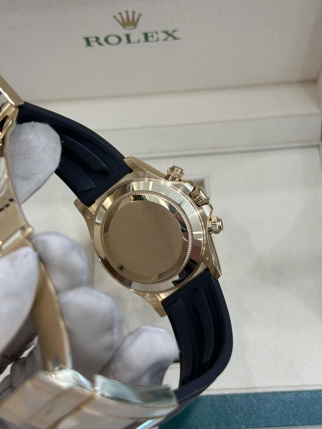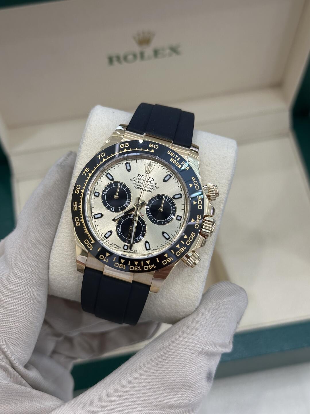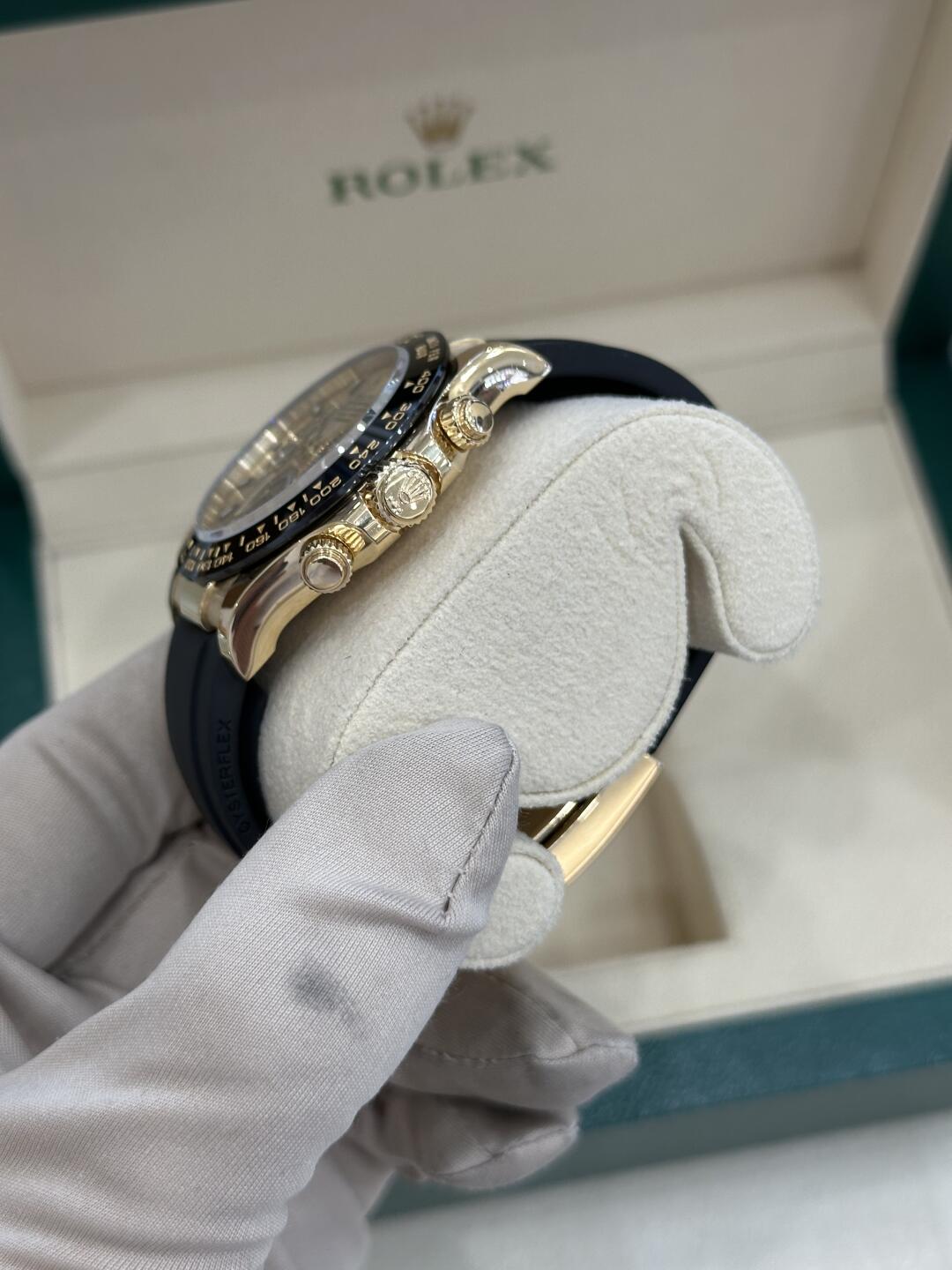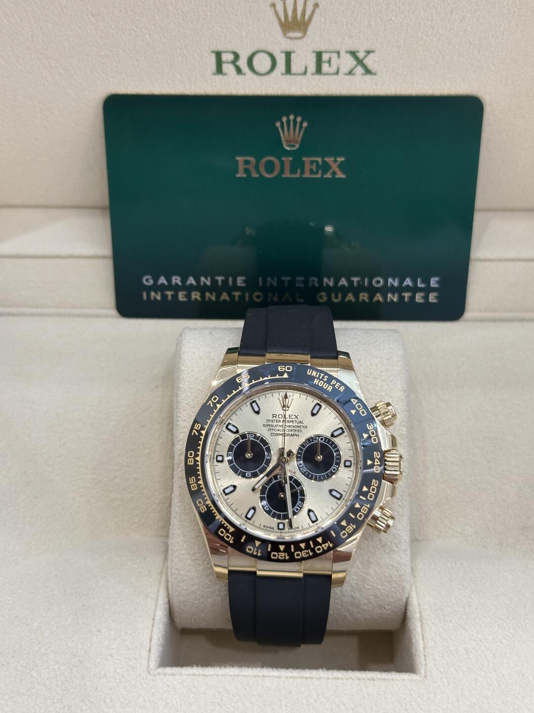 Rolex Daytona Cosmograph (116518LN) self – winding automatic watch, features a 40mm 18k yellow gold case with a black Cerachrom bezel surrounding a champagne dial on a black Oysterflex strap with a yellow gold deployant buckle.