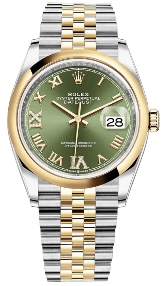 Rolex Datejust 36 Steel & Yellow Gold Olive Green Pave Roman Dial Men’s Watch M126203-0025