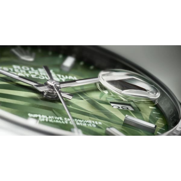Unworn Rolex Datejust 36 Stainless Steel watch. They have Olive green, palm motif Dial, index hour markers fashioned from 18k gold. Highly legible Chromalight display with long-lasting blue luminescence. Monobloc middle case, solid screw-down case back, and winding crown. Scratch-resistant sapphire, Cyclops lens over the date. The domed Stainless Steel bezel. The movement is mechanical self-winding, caliber 3235 with 31 jewels and 70 hours of power reserve. The Oyster Bracelet is Stainless Steel. Folding Oysterclasp with Easylink 5 mm comfort extension link. The water resistance is up to 100m/330ft. The Watch comes complete with store�papers & box. Will include 3 years Store Warranty.