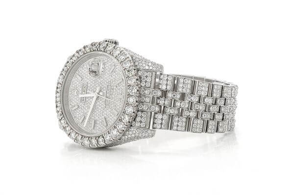 This Rolex DateJust is made of Silver and has a 36mm case size with 17.00ctw of Moissanite diamonds. Our expert watchmakers have serviced this watch inside and out to Rolex quality standards. This watch comes with an Rolex box.