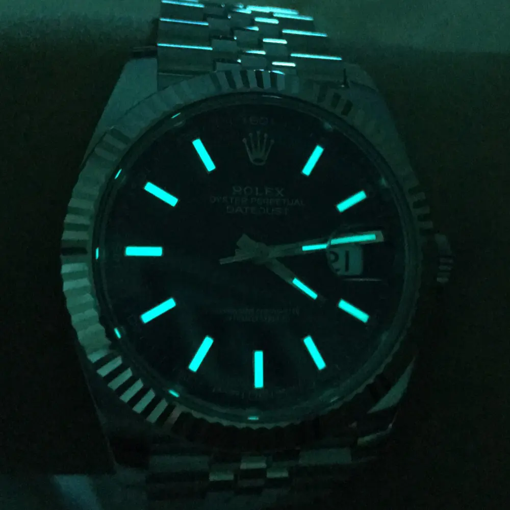 Rolex Datejust Swiss Replica watches are equipped with the new SuperLuminova�� Blue glow luminescent pigment that after sufficient activation by sunlight or artificial light will glow in the dark up to nine hours with uniform luminosity throughout.