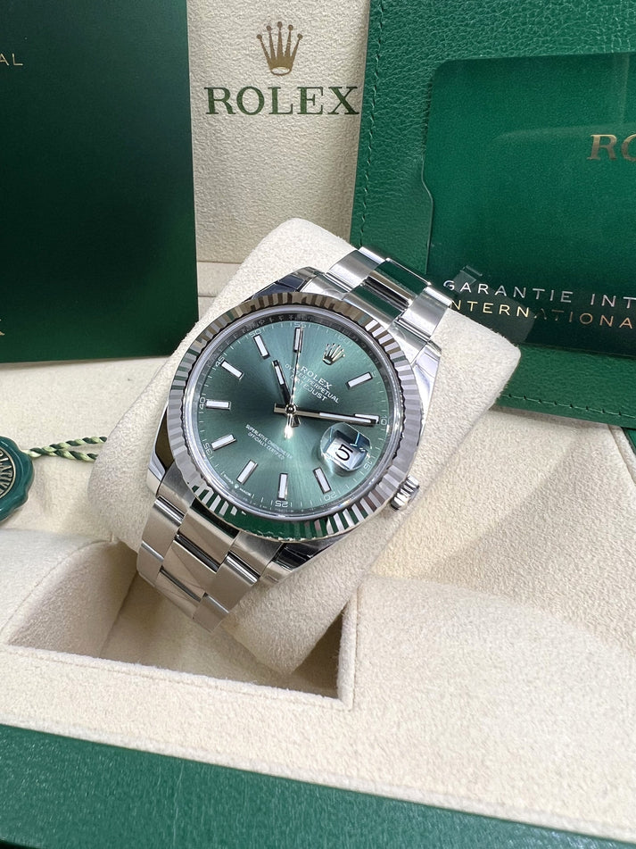 Just released by Rolex with this stunning Mint Green dial, this is by far our favourite 41mm Datejust.