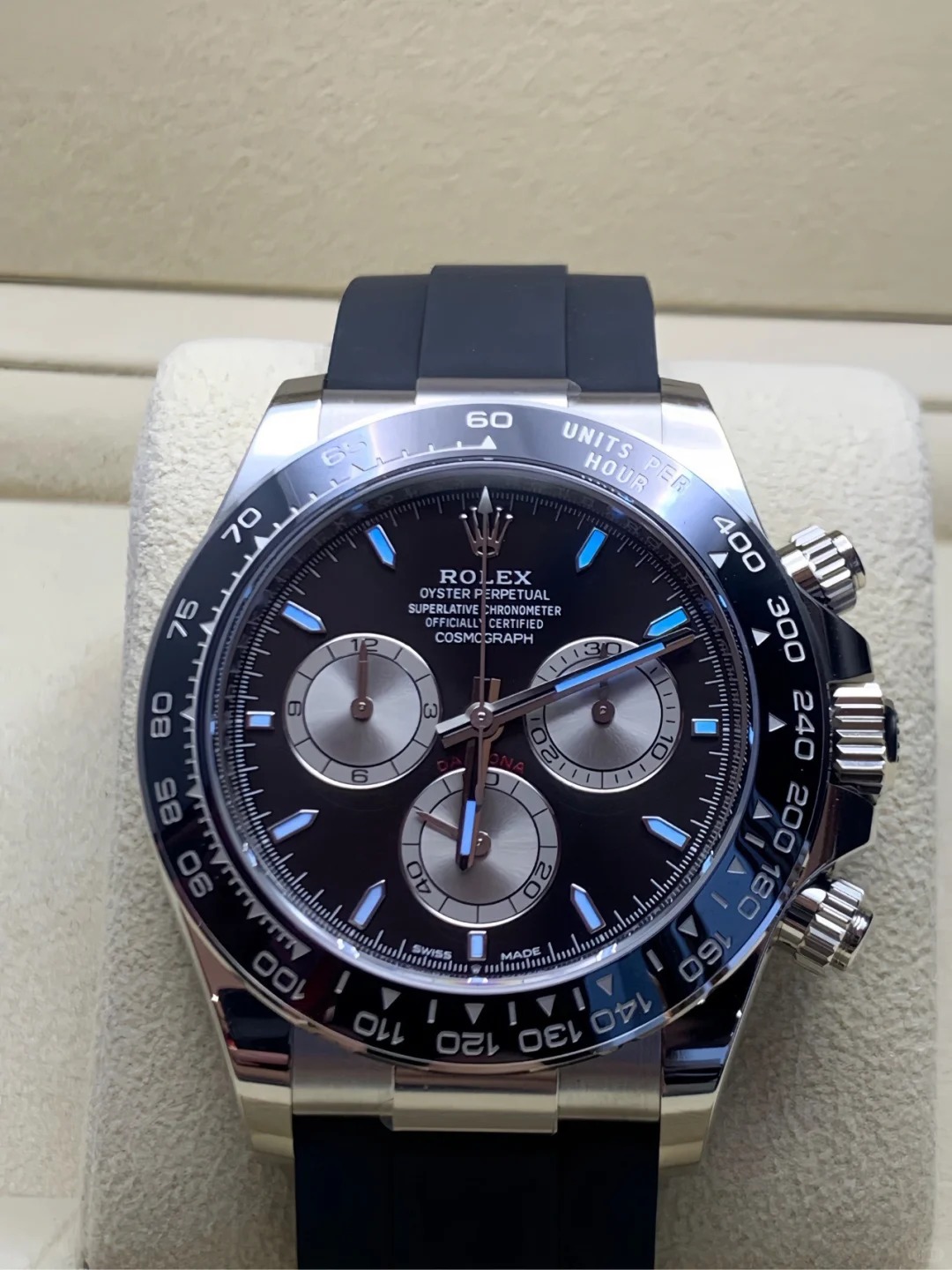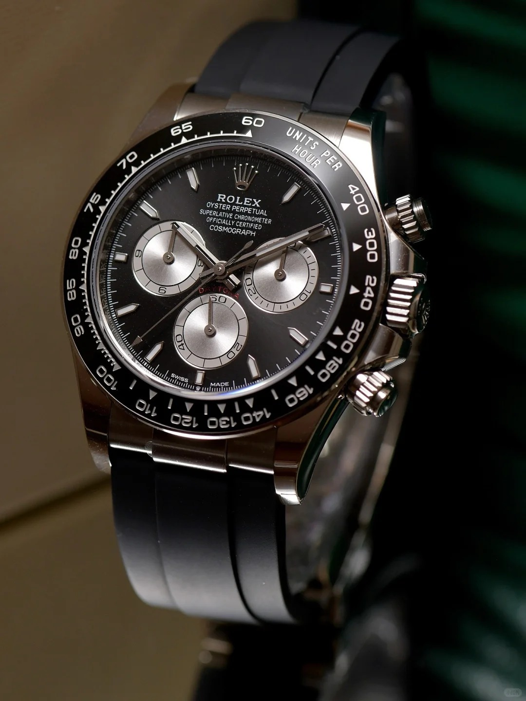 The Rolex Daytona 126519LN “Baby Le Mans” is a striking chronograph crafted in 18k white gold, featuring a 40mm Oyster case with a monobloc black Cerachrom ceramic bezel engraved with a tachymetric scale—ideal for measuring high-speed intervals. Its dial is a bold combination of bright black with contrasting silver-toned sub-dials at 3, 6, and 9 o’clock, evoking the aesthetic of vintage racing chronographs and paying tribute to Rolex’s deep motorsport heritage, particularly the 24 Hours of Le Mans. Powered by the in-house Caliber 4131, this self-winding movement features a 72-hour power reserve, Rolex’s Chronergy escapement for superior energy efficiency, and Paraflex shock absorbers for enhanced durability. Luminous Chromalight hour markers and hands ensure readability, while the signature Oysterflex bracelet—reinforced with a flexible titanium-nickel blade—offers the sporty feel of rubber with the structural integrity of metal. It’s secured with an 18k white gold Oysterlock clasp and equipped with the Rolex Glidelock system for easy adjustment. Water-resistant to 100 meters, the “Baby Le Mans” is a high-performance, highly collectible Daytona that masterfully blends luxury, sport, and engineering precision.
