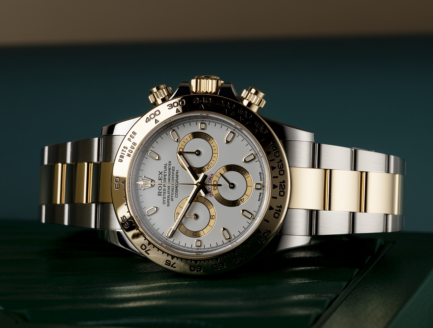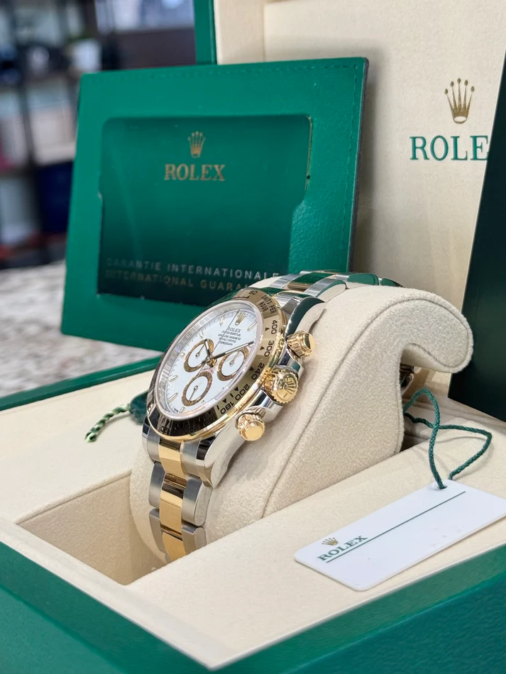 Rolex Daytona Cosmograph (116503) self – winding automatic watch, features a 40mm stainless steel case with an 18k yellow gold bezel surrounding a white dial on a stainless steel and 18k yellow gold Oyster bracelet with folding buckle.