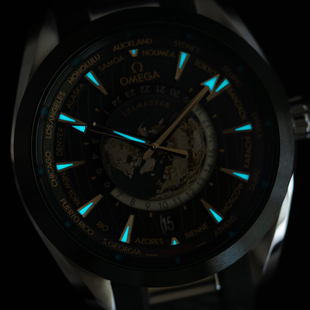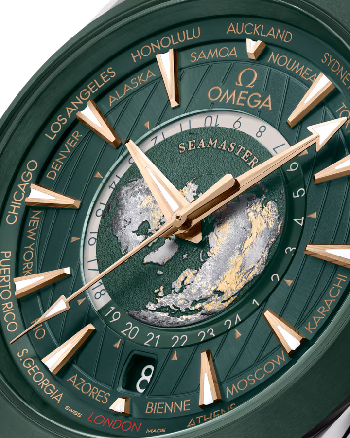 The Omega Seamaster Aqua Terra 150M Co-Axial Chronometer GMT World Timer 43mm (reference 220.32.43.22.10.001) is a striking timepiece with a rich green dial and accents of moonshine gold, giving it an elegant yet calming appearance. Released in 2023, this model stands out for its world timer function, allowing users to easily check the time in 24 cities around the globe. At the center of the dial, a titanium plate features a highly detailed 3D laser-engraved globe, adding to its allure. Powered by the METAS-certified Master Chronometer Caliber 8938, it delivers high precision, with a 60-hour power reserve and magnetic resistance up to 15,000 gauss. The watch is water-resistant up to 150 meters, making it both reliable and functional for everyday use. Its transparent case back further showcases Omega’s refined craftsmanship.