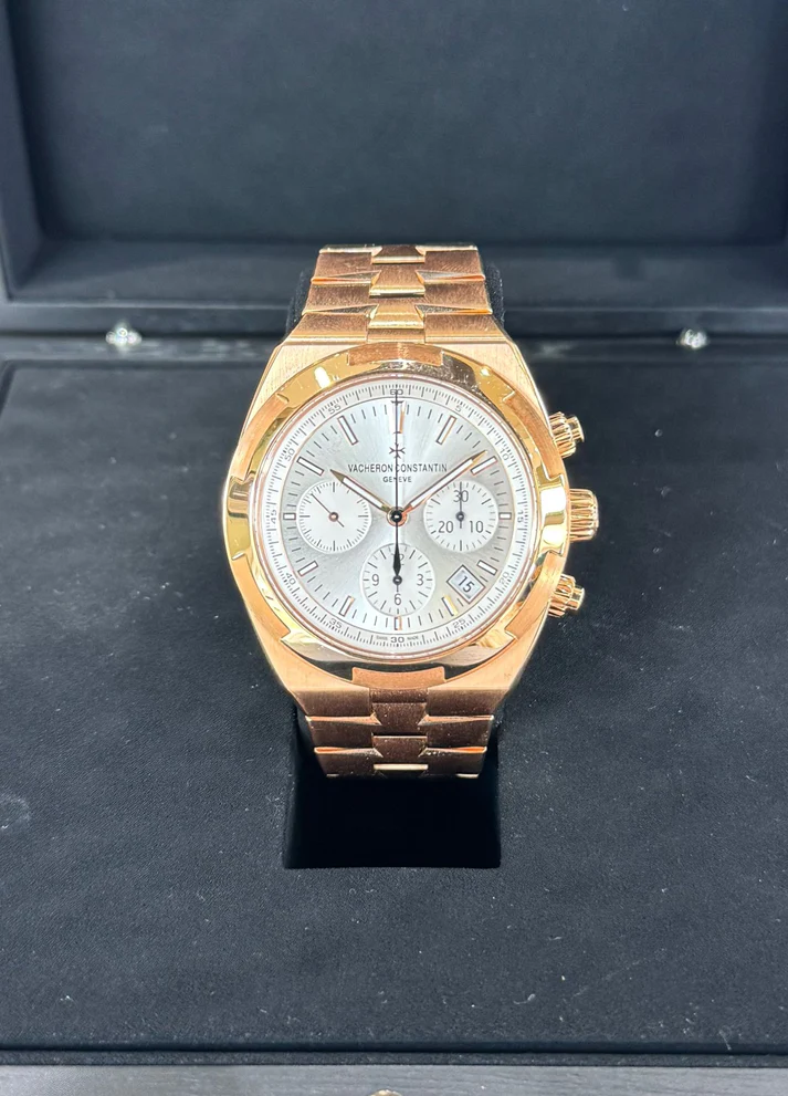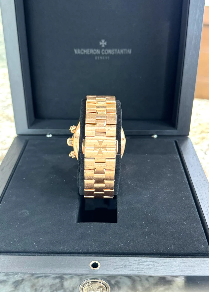 Unworn Vacheron Constantin Overseas Chronograph 5500V/000R-B074, 42.5 mm. The watch has White Dial. The Case is 18K 5N�rose gold, Caliber # 5200 w/ 54 Jewels, 52 hours power reserve. The Bracelet is Mississippiensis alligator with Deployant buckle. The Water-resistant is up to 150 m. The Watch comes complete with Vacheron Constantin Papers & Box. Covered with Vacheron Constantin 2-Year Warranty.